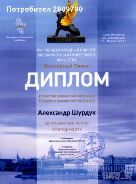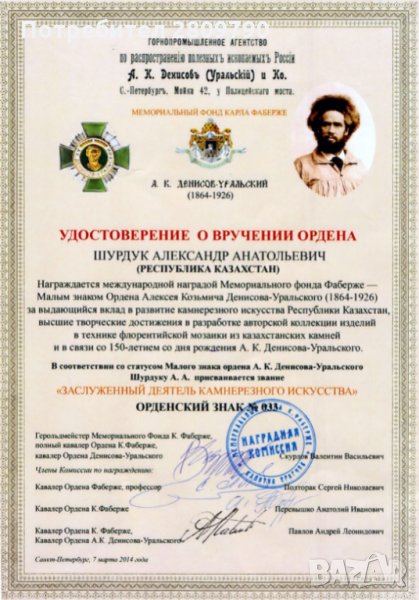 Автор: Александър Шурдук, член на Съюза на художниците на Казахстан, заслужен работник на изкуството за рязане на камъни, командир на ордена на А. К. Денисов-Уралски (Международна награда на Мемориалния фонд на Фаберже). Негови творби са изложени в залата на официалните приемни на резиденцията на президента на Република Казахстан / ”Ак-Орда” в Нур-Султан /, както и в частни музеи и колекции в Казахстан и по света в чужбина.