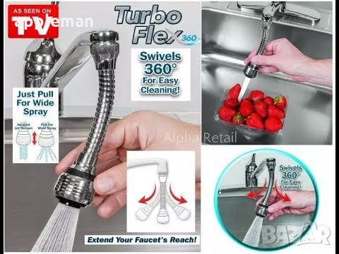Лесно достъпен накрайник за чешма с гъвкава структура Turbo Flex 360. Знаем, че системите за чешма с гъвкава структура са доста скъпи и не всяко домакинство има възможност да си позволи да си ги вземе. Затова ние ви предлагаме един много по евтин вариант. Вместо да сменяте смесителя с нов му сложете гъвкавия удължител и ще усетите мигновено разликата. Много по удобно ще ви бъде когато изплаквате мивката или искате да измиете някой по голям съд, тъй като е направен от гъвкава структура, която ти позволява да използваш и въртиш удължителя на 360 градуса. Не се колебай, защото всеки заслужава удобство в своя дом без да утежнява това вашия бюджет.