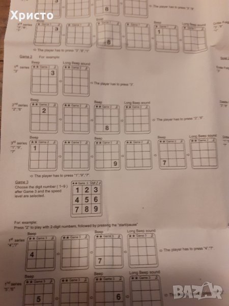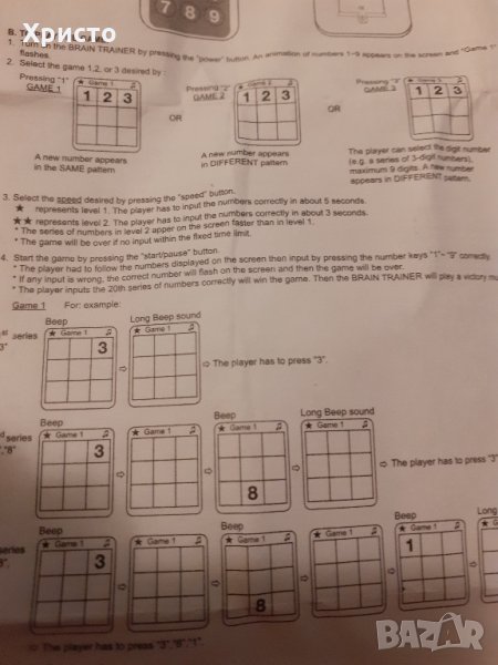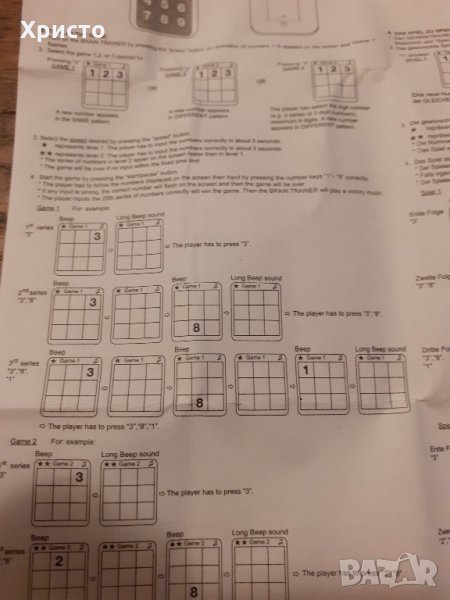 Продавам игра за памет и концентрация Brain Trainer, електронна, работи с 2 батерии 1,5 волта клас ААА, които не са включени в цената. Размер 12х5,5х2 см. Уникална и много рядка. Прилагам инструкция за играта на английски.