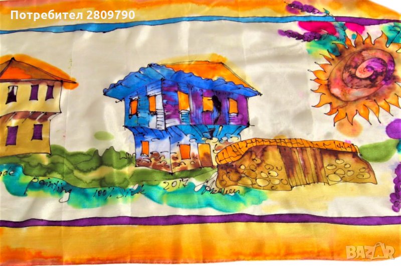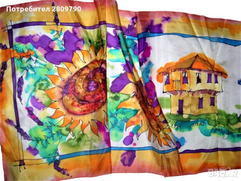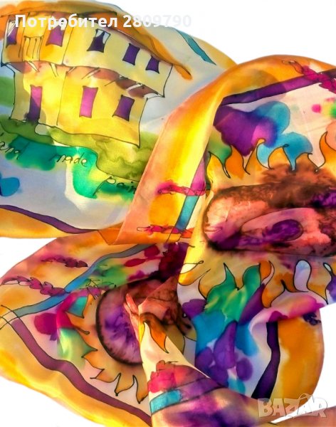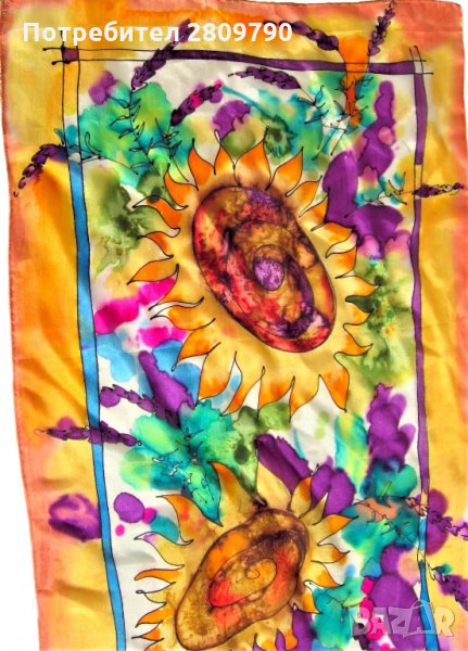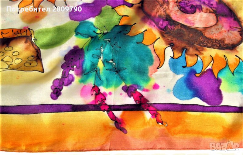 Многоцветна, ярка, сочна, в акварелна техника на свободно рисуване с коприна. Подходящ за шикозен подарък, като сувенир от България, подарък за мама, приятелка, сестра, подарък за рожден ден, коледен подарък.