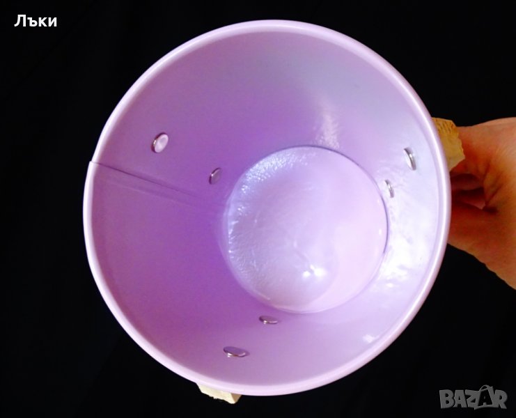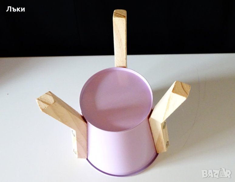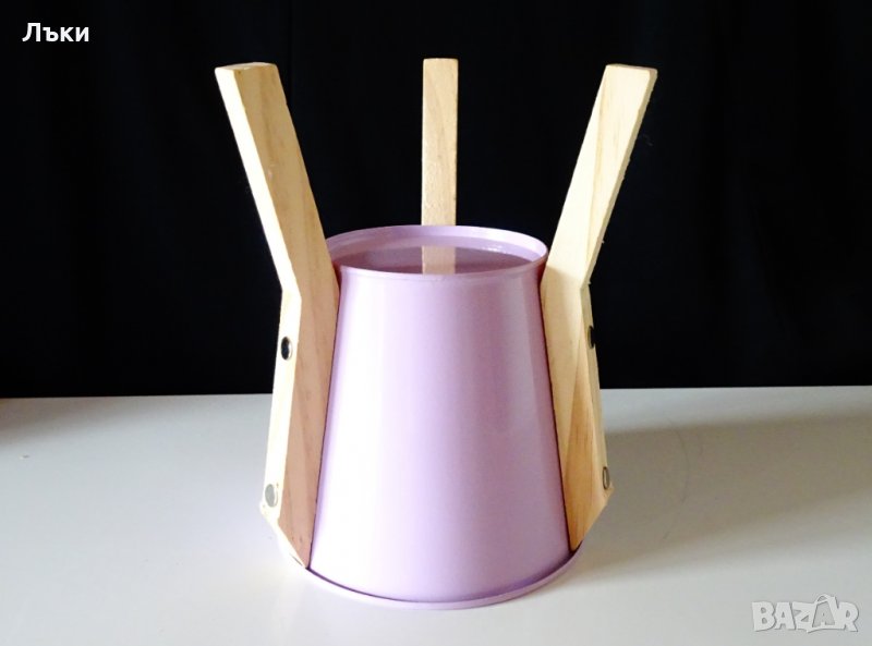 естествено дърво.Вътре има предпазен целофан.Височина 19 см.,височина само на съда 12.5 см.,диаметър 13 см.