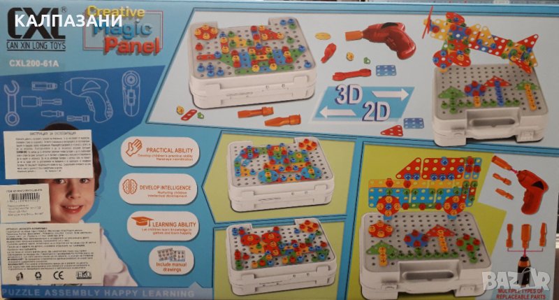 Детски конструктор тип "мозайка", включващ винтоверт с батерии, винтчета, гайки, ключове отвертки и др. части за забавление на деца, чрез сглобяване на фигурки и предмети. Развива въображението и моториката на малчуганите.