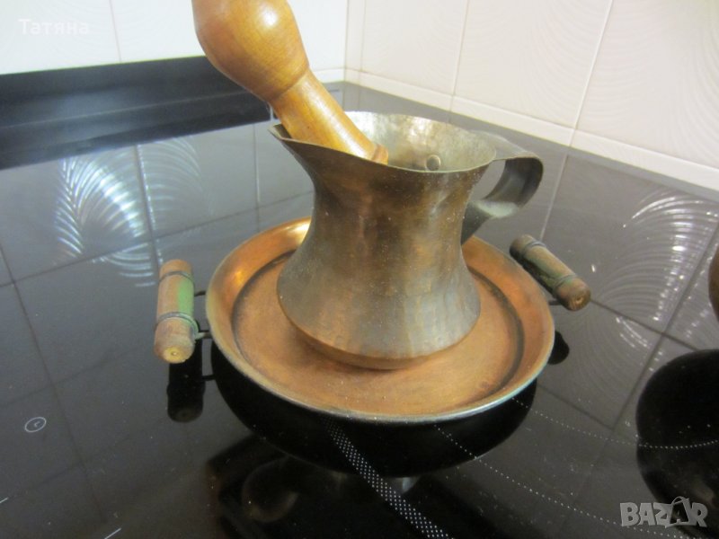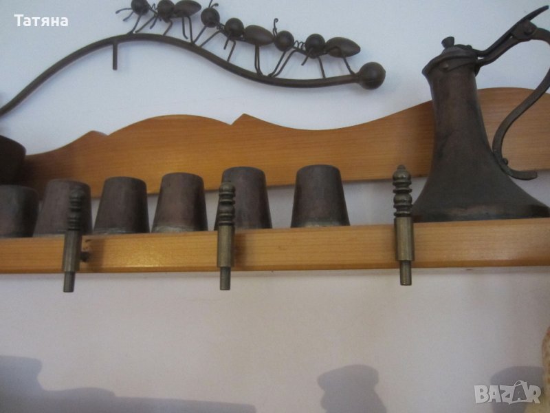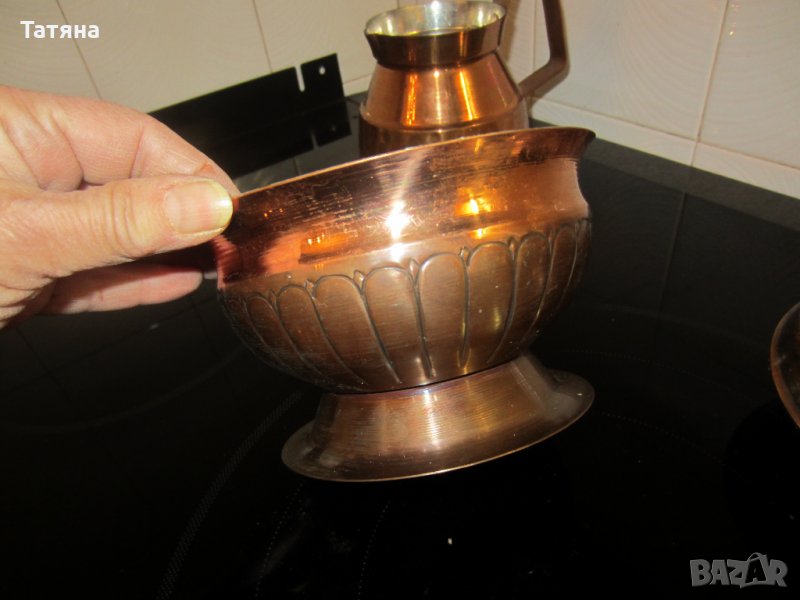 Снимка-1,2,3-СЕРВИЗ ЗА КАФЕ С ДЖЕЗВЕ–КАНА и ТАБЛА.Изработено от ръчно кована и лята мед.Диаметър тава 27см ,Чашите от вътрешната страна са керамични /за да могат освен за сувенир и декорация да се използват и по предназначение.Този модел е изработен през 50–години и е закупен от СБХ. Цена 140 €; Масивен бакър.