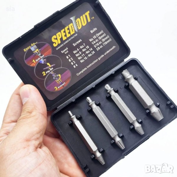 - Комплект екстрактови SPEED OUT за развиване и вадене на скъсани или разядени болтове.