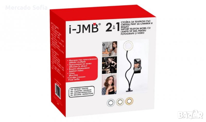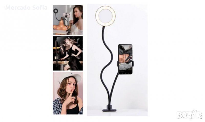 Подвижна основа с голямо колче за закрепване към маса. За многократна употреба и е идеален за стрийминг на живо, видео разговори, за снимки. Той има диаметър 9 см, мощност 12W, лека студена / гореща / смесена, 10 нива на яркост и е подходящ за мобилни телефони с размер 4,7-6,5 инча. С гъвкави, но стабилни ръце, за да ги поставите във всяка позиция, която искате.