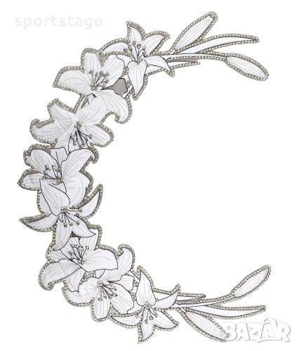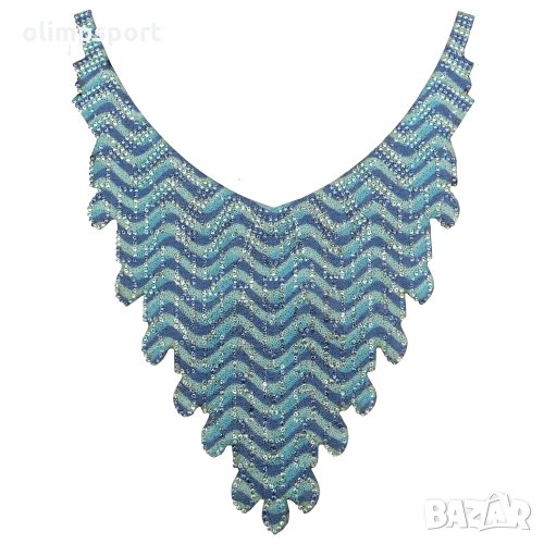 Декорация с камъчета диаманти във формата на огърлица. Декорацията се залепва върху дрехата с помощта на ютия или термотрансферна преса. Подходяща е за украса на гимнастически, балетни и танцови трика, сценични облекла, тениски, блузи или рокли. Блестяща и ефектна декорация, която ще придаде уникалност на всяка дреха. Размери - 20.5х19 см. 12лв