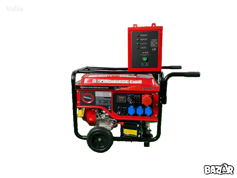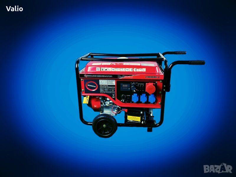 Новите 9.5 KW бензинови четиритактови генератори BULLMAX, за монофазен и трифазен ток, с вградена фабрична автоматика в генератора и управляващо напълно автоматично старт-стоп табло, които служат за автоматичното стартиране/спиране на генератора при отпадане/ възстановяване на основното ел. захранване. Този модел генератор има вградена букса с която при закупуване на контакторна кутия генератора става напълно автоматичен. Гарантирано безотказно и без никаква човешка намеса. При прекъсване на тока в автоматичното старт-стоп табло, управляващо генератора има монтиран автоматичен таймер, който прави три последователни опита за стартиране на генератора. Автоматичният таймер, след възстановяване на електричеството гаси автоматично генератора след 30 секунди. В управляващото табло има вградена изцяло автоматична двупосочна контакторна система, не позволяваща на генератора при отпадане на нормалното електричество и при включване на режим генератор да се върне ток към електропреносната мрежа. И обратно – при възстановяване на нормалното електричество спира автоматично подаването на ток от генератора към електрическото табло. ВГРАДЕНО АВТОМАТИЧНО ЗАРЯДНО ЗА АКУМУЛАТОРА. При нашите генератори автоматичното старт-стоп табло следи за нивото на заряд на акумулатора и при нужда го дозарежда до нужния заряд, за да може всеки път генератора да стартира безупречно. Когато генератора не е превключен на режим автоматика, паленето на генератора е с ключ, който е на управляващото табло. Генераторите са с медни ротори и статори и са оборудвани с автоматичен смукач. Бензинов Двигател VТR 800 с въздушно охлаждане, 18 конски сили. Работна честота: 50 Hz. Вграден AVR /Automatic Voltage Regullator/.Автоматичен предпазител против претоварване на генератора. Магнетен стартер и автостартер с ключ и акумулатор. Транспортна рамка с колела и дръжки за по-лесно предвижване на генератора. Генератора има вграден дигитален дисплей показващ изходящият моментен волтаж, херцовете и отработените моточасове. 3 броя изходи за 230 V, 1 брой за 380 V и един изход за 12 V. Нивото на шума е 69-72 dB. Разход: 450 грама бензин на киловат час при пълно натоварване. Размерите му са: дължина 68 см., ширина 51 см. и височина 55 см. Тегло бруто с автоматиката 110 кг.Гаранционен и след гаранционен сервиз.