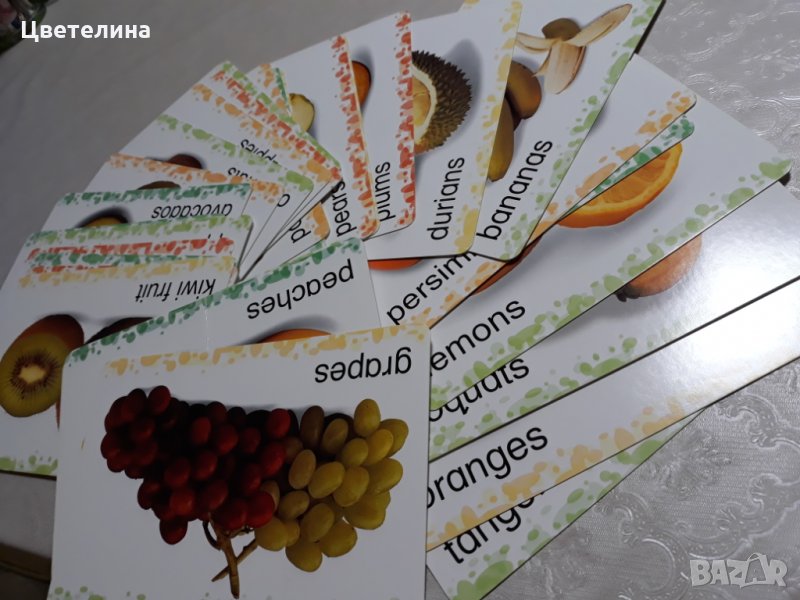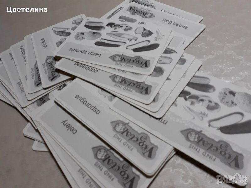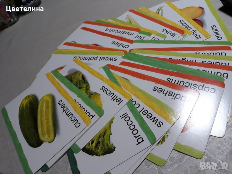 Образователни игри за най- малките деца по английски език (пладаве и зеленчуци) . Съдържат по 32 карти . Цената е общо за двата комплекта .
