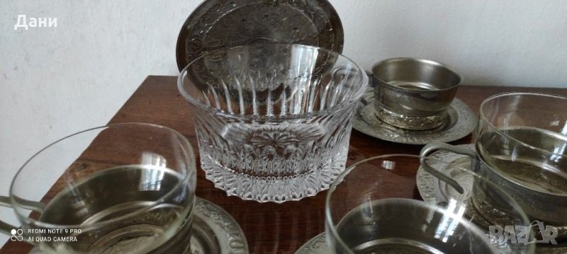 Стар сервиз , с посребрена повърхност. Състои се от: 4 чаши с чинийки,на едната липсва стъклената чашка. Чашите са огнеупорни. Захарница е кристална с посребрен капак.
