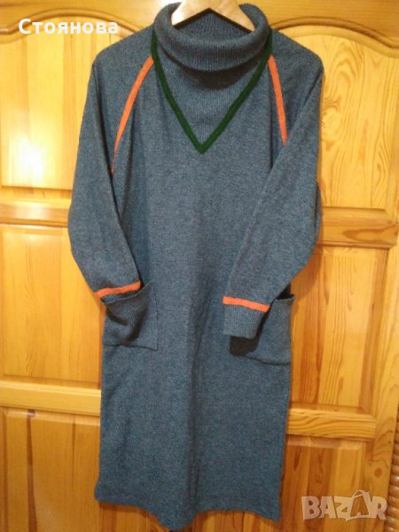 Продавам Рокля/туника 42 размер, спортно-елегантна, тъмно графитен цвят с поло яка и кантове оранжев и тревисто зелен цвят, два джоба, измерени ориентировъчно размери: дължина на роклята 98 см., дължина ръкав - от врата до края на ръкава - 65 см., от рамото - 54 см.), широчина едностранно - 46-48 см. Цена - 16 лева.