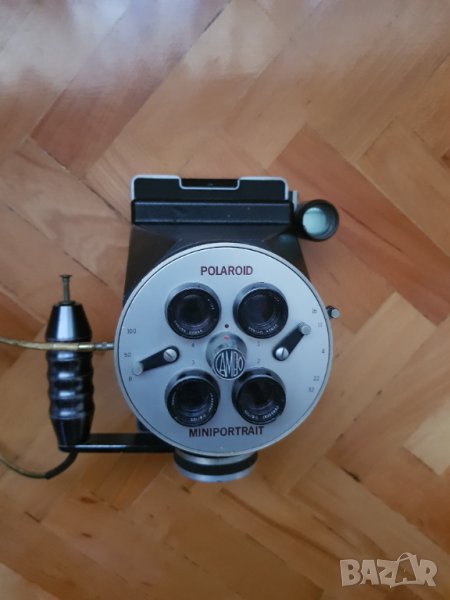 Около 1966-1976. Винтидж професионална паспортна мигновена камера, прави четири изображения на всеки филмов лист. Форматът на изображението е 2 × 2 изображения в правоъгълник 73 × 85 mm, всяко изображение около. 36 × 42 мм. Гърбът на камерата е оригинален държач за филми Polaroid за касети с моментален филм Polacolor 125i.В добро състояние.