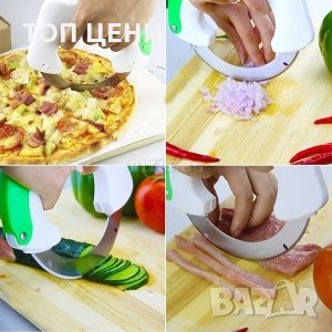 Страхотен кръгъл нож за рязане и кълцане на зеленчуци, подправки, месо или пица! Острието на ножа се върти на 360 градуса, което го прави много удобен и лесен за работа - за секунди реже или кълца на ситно. Удобната дръжка позволява здрав захват и не се изплъзва. Ножът има заключващ механизъм и предпазител за острието, което го прави безопасен при съхранение.