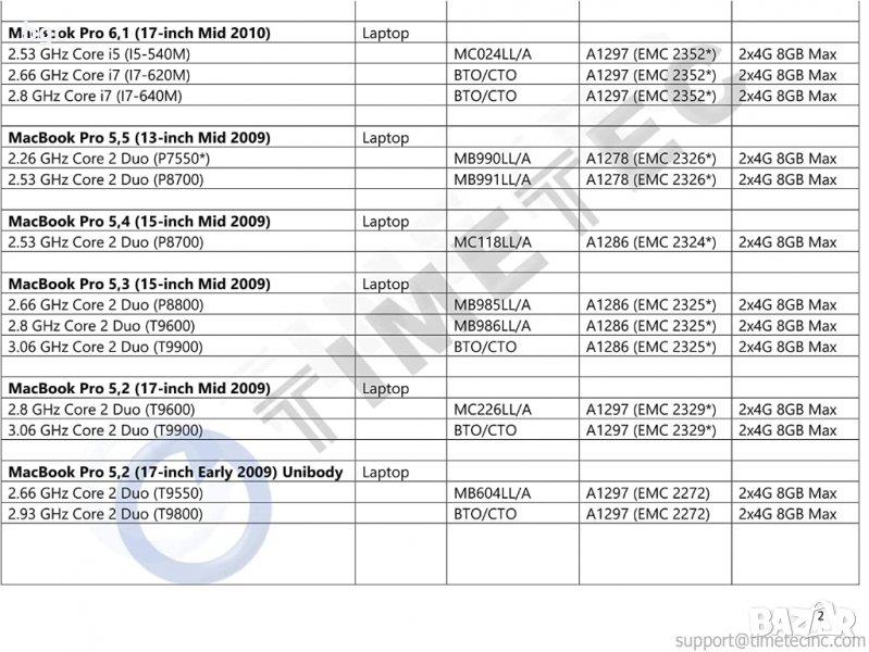 MacBook Pro: MacBook Pro (15-Inch Late 2008), MacBook Pro (17-Inch Late 2008), MacBook Pro (17-Inch Early 2009), MacBook Pro (13-Inch Mid 2009), MacBook Pro (15-Inch 2.5Ghz Mid 2009), MacBook Pro (15-Inch Mid 2009), MacBook Pro (17-Inch Mid 2009), MacBook Pro (17-Inch Mid 2010), MacBook Pro (15-Inch Mid 2010), MacBook Pro (13-Inch Mid 2010)