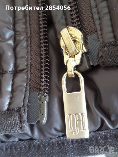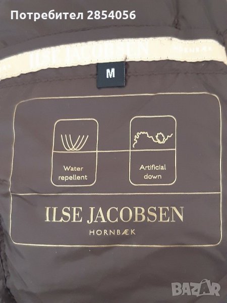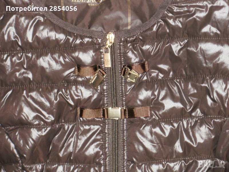Якето е на ILSE JACOBSEN, ново. Пълнежа е силикон. Цвета е шоколадово кафяво с модерни закопчалки в златно. Закопчава се с цип, има вътрешен джоб. Дължината на ръкава е под лакета, много е модно. Има лого на ципа и вътре. По номер е М.