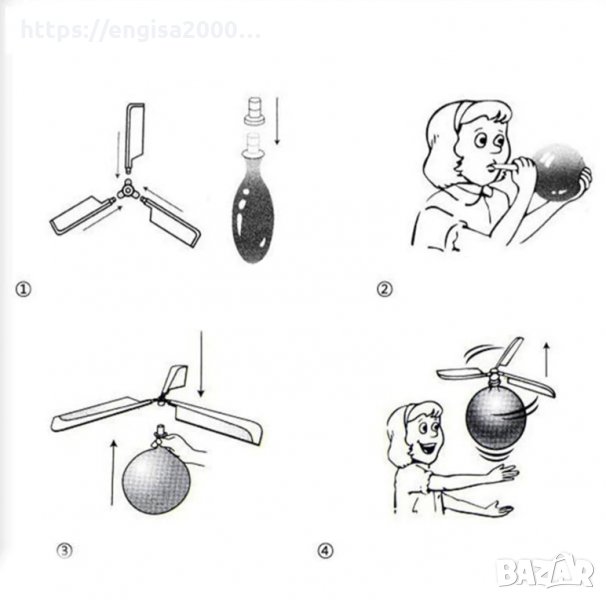 Летящата играчка се състои от 5 части + два балона и инструкция за сглобяване.