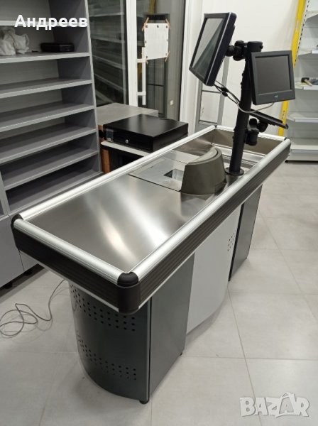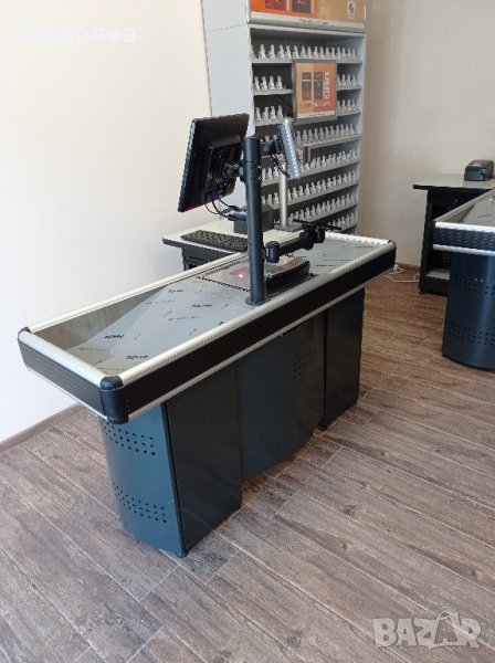 Предлагаме също и касови модули с дължина: 1,85m и 2,10m с двоен кош и вградени баркод скенер Дейта лоджик Магелан с везна Бизерба и вградено чекмедже за банкноти с горно отваряне.
