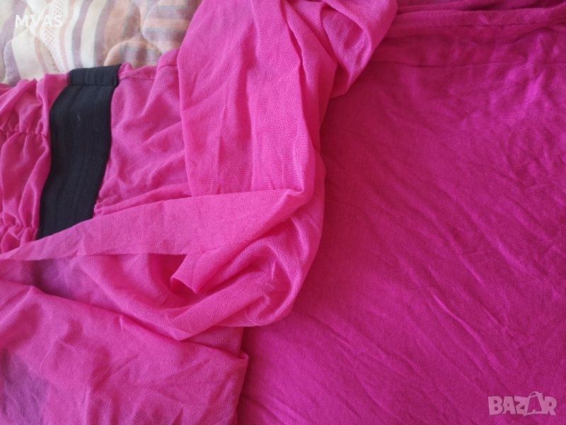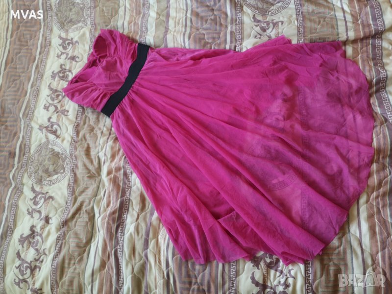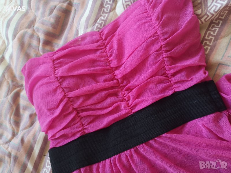 Тъмно розова рокля, без ръкави, бюстие с ластик и меки подпънки, отзад е с по-дълъг воал, има къс памучен хастар отдолу, за да не прозира. Черен ластипен вталяващ колан, висока талия.