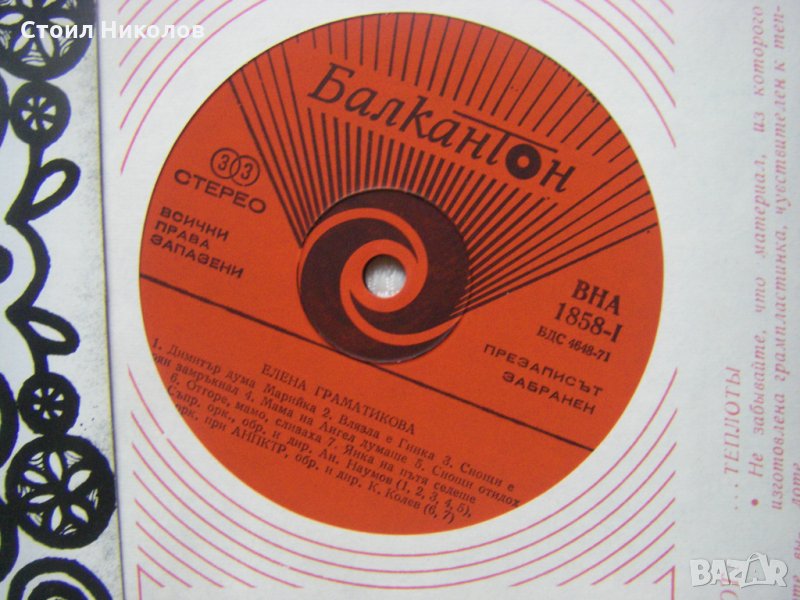 Грамофонна плоча - ВНА 1858 - Тракийски народни песни изпълнява Елена Граматикова, Хумористични любовни шопски песни изпълнява Кремена Станчева и Василка Андонова