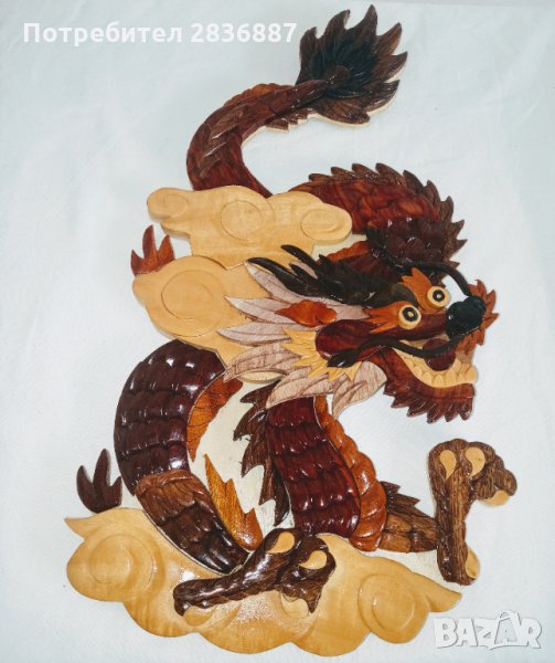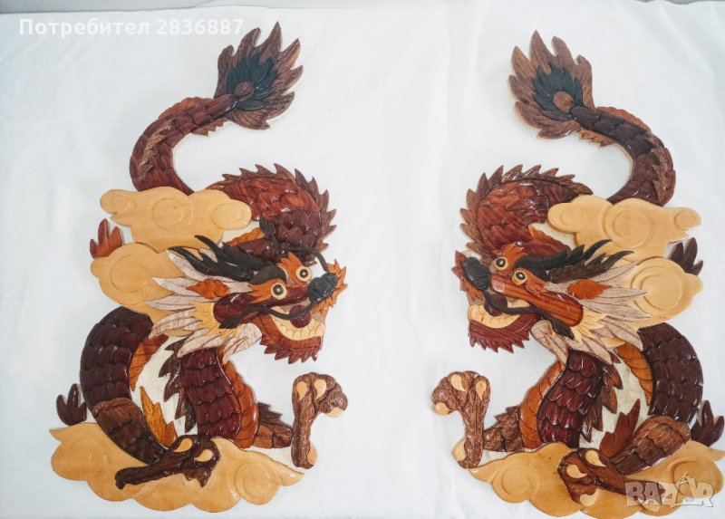 Пластиките са в отлично състояние и представляват резбовани дървени мозайки залепени върху дървена основа и описващи елементи от източната култура.. Състоят се от двойка дракони и двойка китайски момичèта. Пластиките на момичèтата са с размери 33 на 43 см. а на драконите са 26 на 45 см. дебелината на пластиките е 1,5 см. Цената е за комплекта от 4 те пластики. ако се закупват поединично цената е 15 лева за брой.