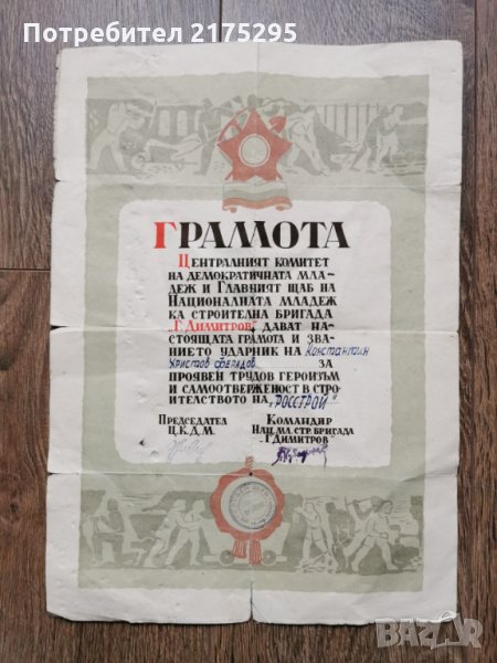 грамота от соца, снимка 1 - Антикварни и старинни предмети - 31853379 грамота от соца, снимка 2 - Антикварни и старинни предмети - 31853379 1/2