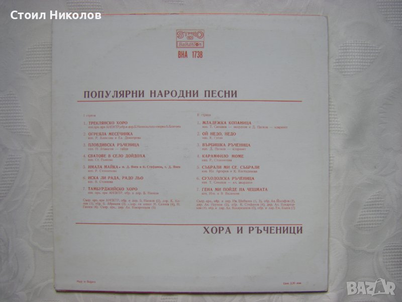 Грамофонна плоча - ВНА 1738 - Популярни народни песни, хора и ръченици