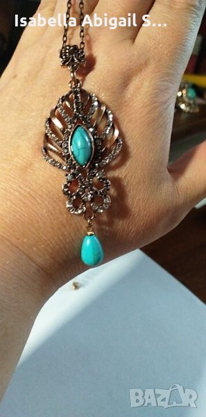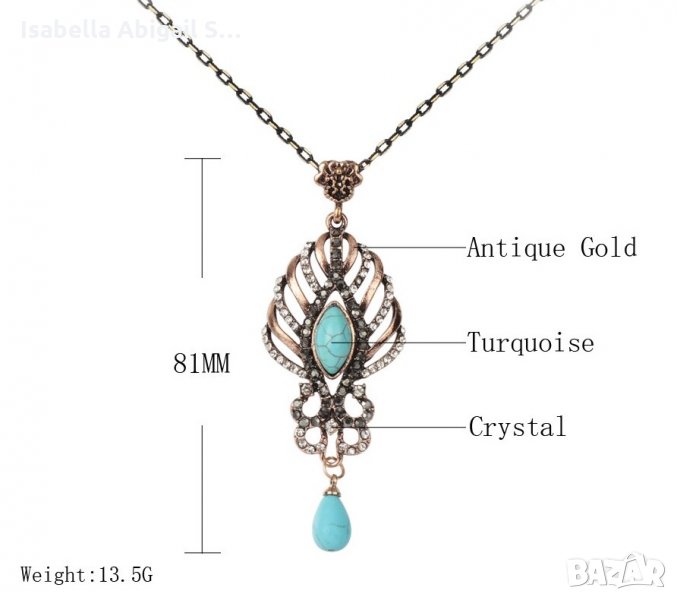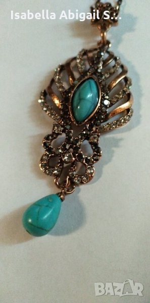 Колие от цинкова сплав, имитация на антично злато, тюркоази и искрящи кристали.