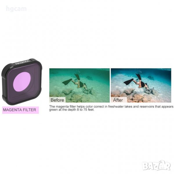 9/10/11 Black, към която приляга перфектно също както оригиналната леща. Осигурява изключително подобрение на подводните кадри при гмуркане и практикуване на водни спортове. Този професионален лилав филтър за гмуркане подобрява цветовете и увеличава контраста при различни условия на подводно видео и фотография;