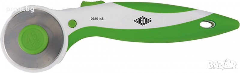 Wedo Comfortline кожарски, сарашки дисков нож 45 мм, немски, внос от Германия. Дисков нож 45 мм с вграден предпазител на острието (плъзгащ механизъм). За рязане на плат, кожа, дамаски, хартия и винил, прецизно и без усилие. Ергономична дръжка с противоплъзгащ ефект. Дръжката е пригодена, както за лява така и за дясна ръка. Заключващ механизъм. За да поддържате острието остро, препоръчително е да не режете хартия и плат с едно и също острие. Размери: приблизително 17,6 x 5 x 2,2 cm, диаметър на острието: 45 mm, цвят: ябълково зелено и бяло.