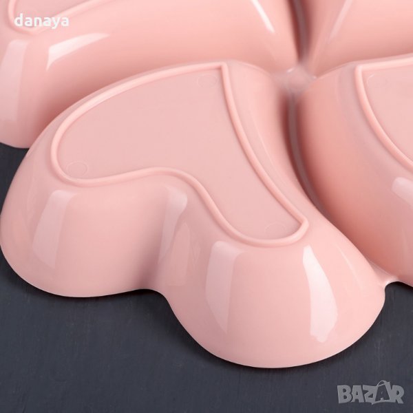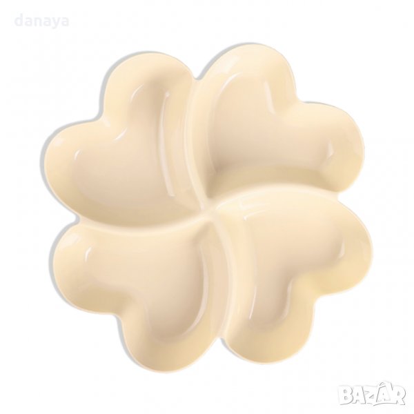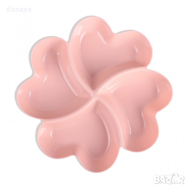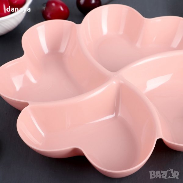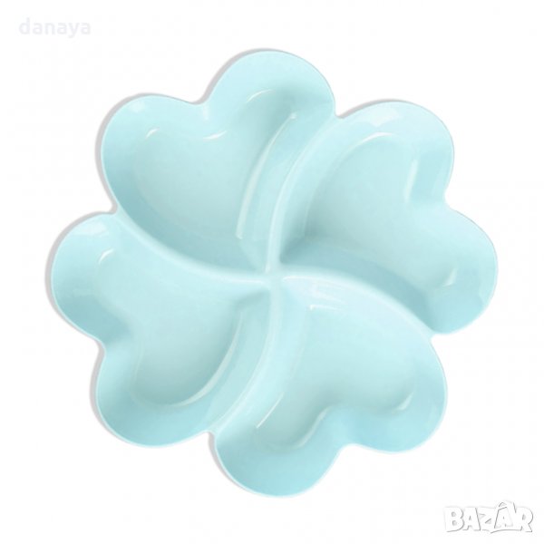 Пластмасов поднос с 4 отделения за сервиране на 4 различни храни като ядки, салати, мезета, маслини, сосове или предястия. Всяко от отделенията е с форма на сърце, което допълнително допринася уют и романтика към трапезата. Купичката е лека и лесна за използване. Предлага се в различни цветове.