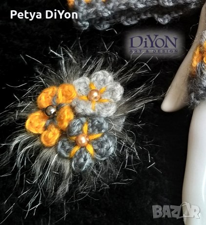 Уникален, ръчно плетен комплект в актуалните цветове - жълто и сиво. Актуално и модерно плетиво, с което ще бъдетете забелязани. Вълна и акрил. С красива украса от плетени цветя. Ръкавиците са с ластици за комфорт.