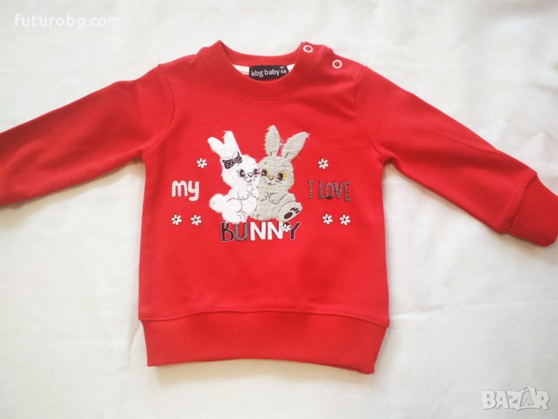 1, Червена блуза с шита щампа на 2 зайчета , с 2 копчета тик так на лявото рамо.