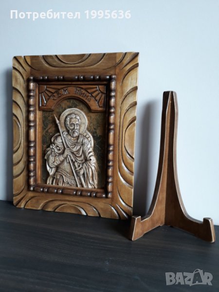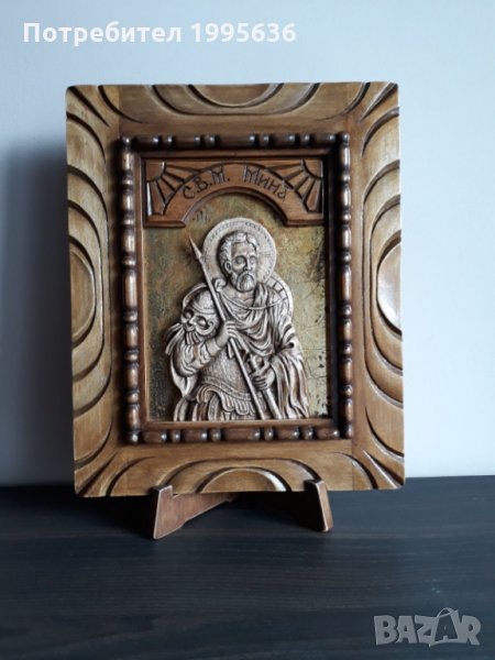 Резбована рамка с релеф на "Св. Мина", ръчна изработка от липа с р- ри 25/31 см. плюс поставка