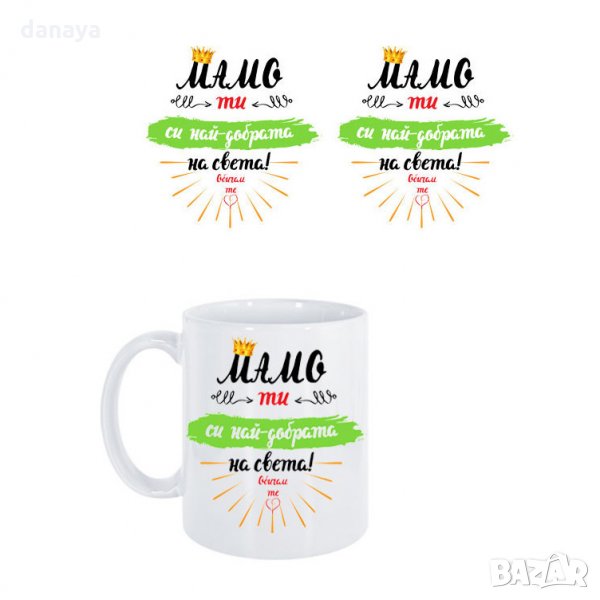 Бяла керамична чаша с надпис “Мамо, ти си най-добрата на света! Обичам те!”. Един красив и нежен подарък за Осми Март – празникът на жената или за рожден ден на мама. Тематичен дизайн, специално създаден за празника на жената. Подарък за мама. Надписът е видим от двете страни на чашата.