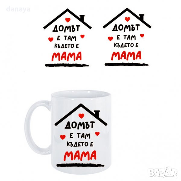 Бяла керамична чаша с надпис “Домът е там, където е МАМА”. Един красив и нежен подарък за Осми Март – празникът на жената или за рожден ден на мама. Тематичен дизайн, специално създаден за празника на жената. Подарък за мама. Надписът е видим от двете страни на чашата.