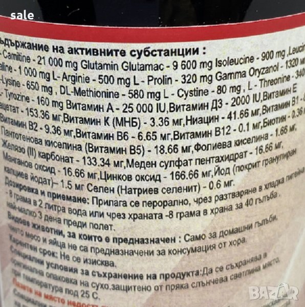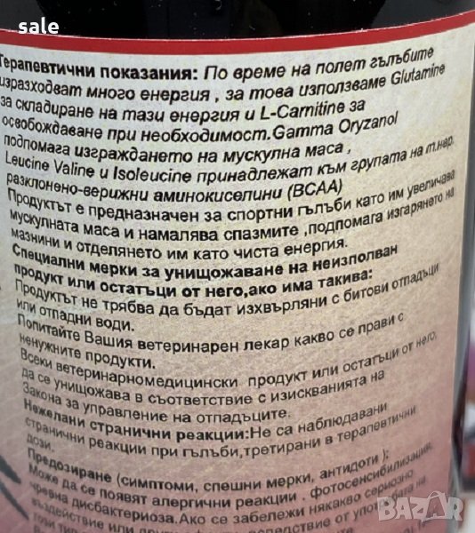 Продукта е предназначен за спортни гълъби като им увеличава мусколната маса и намалява спазмите , подпомага изгарянето на мазнини и отделянето им като чиста енергия. ДОЗИРОВКА И ПРИЕМАНЕ;