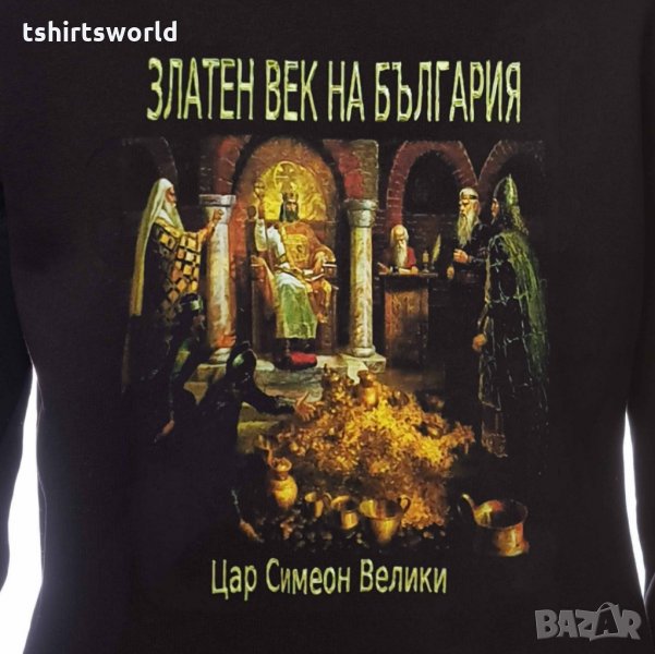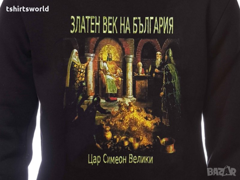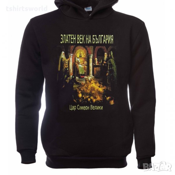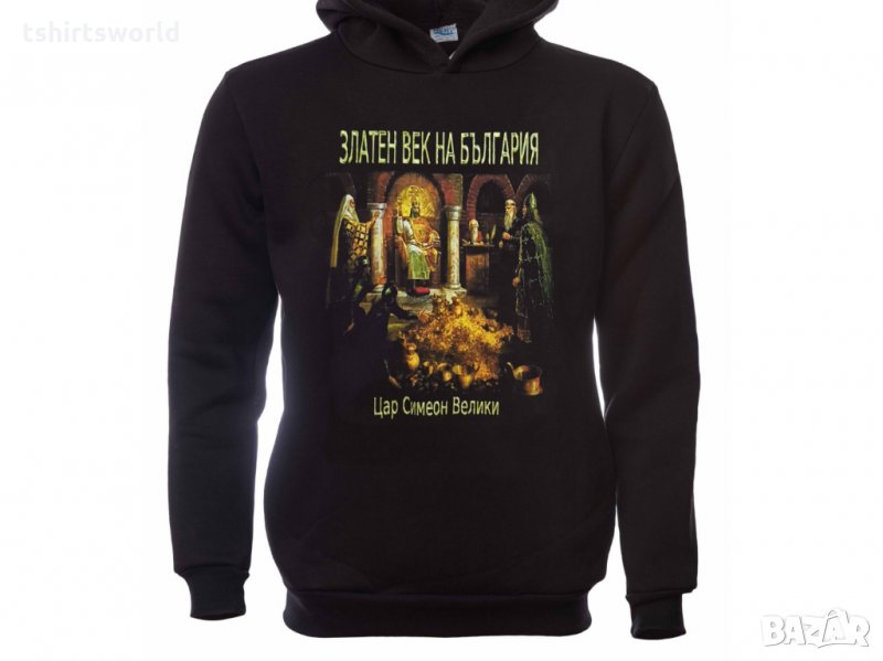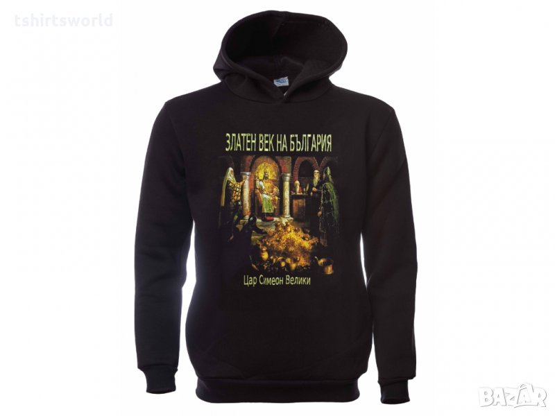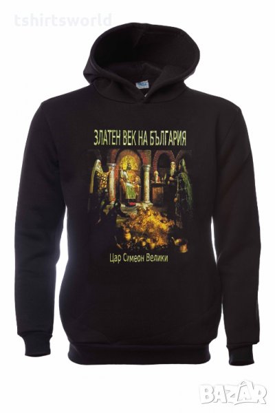 Нов мъжки суичър в черен цвят с качулка, две джобчета и дигитален печат Златен век на България. Произведен в България от висококачествен 100% памук - триконечна пенирана вата с кардировка, което го прави изключително топъл и желан от нашите дългогодишни клиенти. Моделът е подходящ за пролетния и есенно-зимният сезон, има ластични маншети на китките и ханша, запазващи топлината. Разполага с мека подплата и два отворени джоба в страни. Свободната кройка го прави подходящ както за спорт, така и за ежедневно носене с дънкови панталони. Марката PRINTEX от години се слави със своите топли и качествени суичъри.