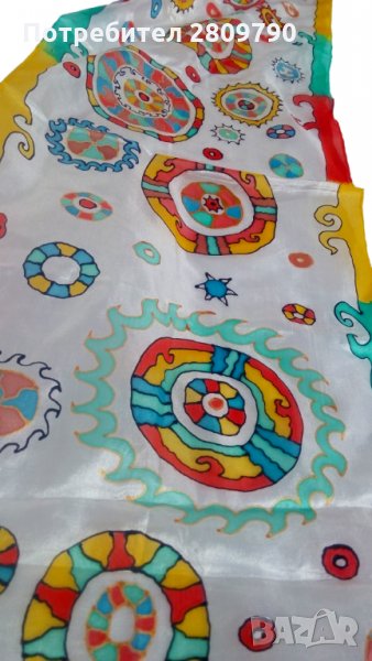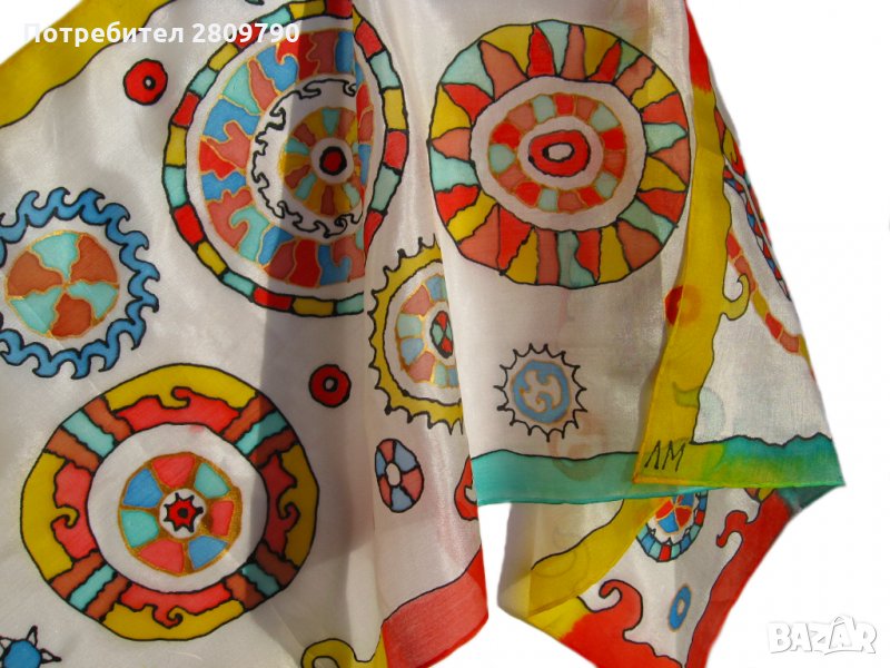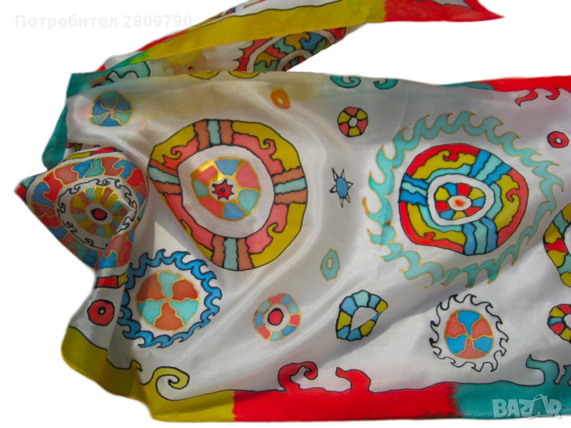 копринени конци. Оригинален стилен подарък ще подчертае вашата индивидуалност или ще бъде незабравим подарък за ваш приятел, сестра, леля, мама. Вълшебните кръгове очароват и привличат вниманието със своята изтънченост и качество на работа. Автор на произведението е Марина Лакшина, дизайнер на костюми, художник на батик и автор на уникални палантини и шалове. Шалът е многоцветен, преобладаващите цветове са зелено, червено на бял фон. Класически стил, всекидневен, за всички сезони. (Размерът може да варира леко поради фиксираните с пара боята)