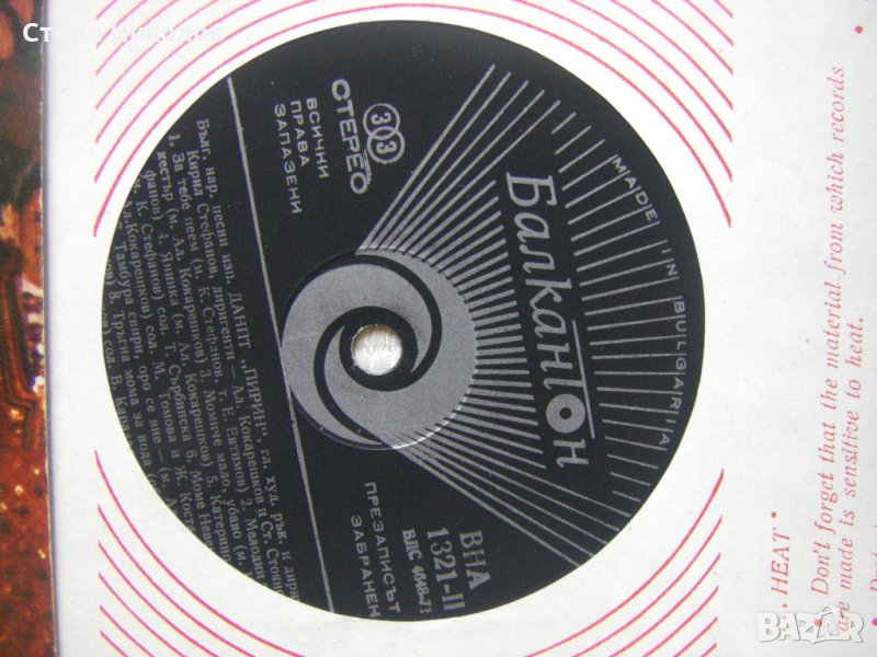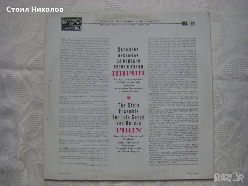 Грамофонна плоча - ВНА 1321 - Български народни песни изпълнява Държ. ансамбъл за нар. песни и танци Пирин; глав. худож. ръководител и диригент Кирил Стефанов; диригенти Александър Кокарешков, Стоян Стоянов