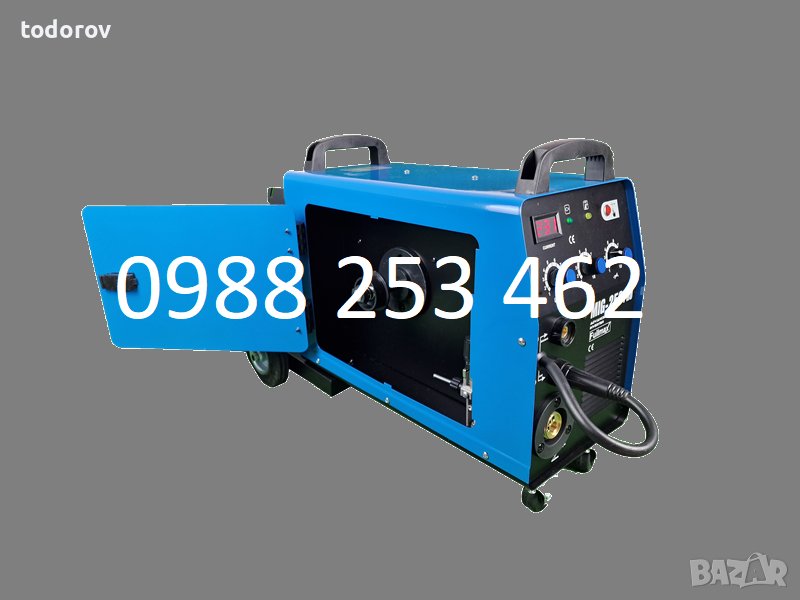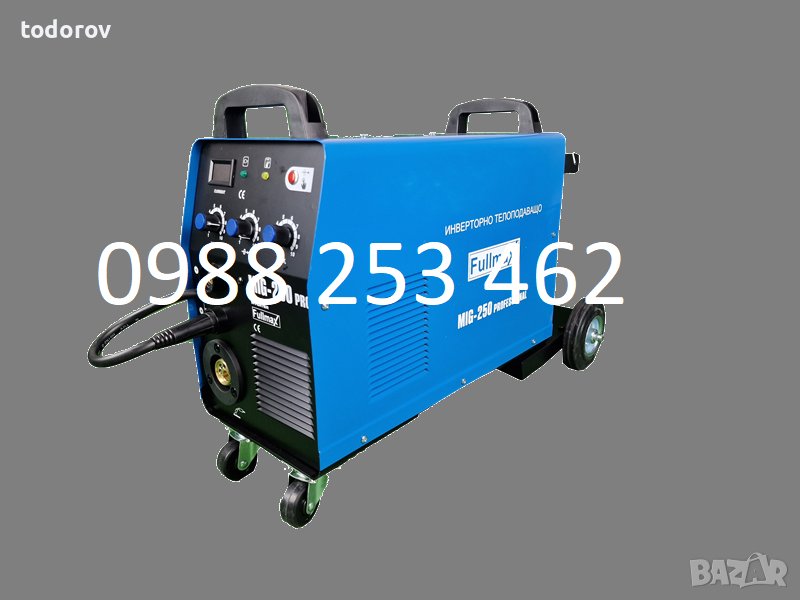 Телоподаващи заваръчни апарати с мощност 250 ампера работещи с телове размер 0.6, 0.8,1.0 и 1.2 мм и с ролки от 1 и 5кг. Окомплектовани са с 4 метра евро шланг, ръкохватка за MIG/MAG заваряване с дълги кабели, щипка маса, маска и чукче с четка, колелца. Регулиране на заваръчния ток /плавно/ 30-250 ампера, монофазни/220V/. Заварява черно (стоманена тел и газ CO2), Алуминий (тел алумин и газ АРГОН. Заварки на бронз, месинг, чугун, и черно-както помежду им, така и поотделно с помеднена тел+ГАЗ АРГОН. Заварява и неръждавейка с неръждаема тел и ГАЗ АРГОН.