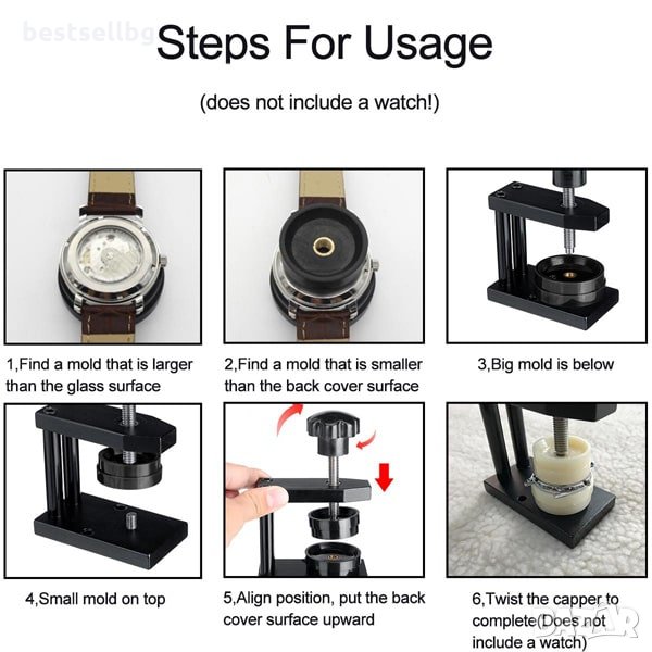 Mашина за затваряне на часовници, преса за затваряне на часовници с 12 матрици които няма да надраскат или изкривят кристали, са подходящи за часовници с различни размери.
