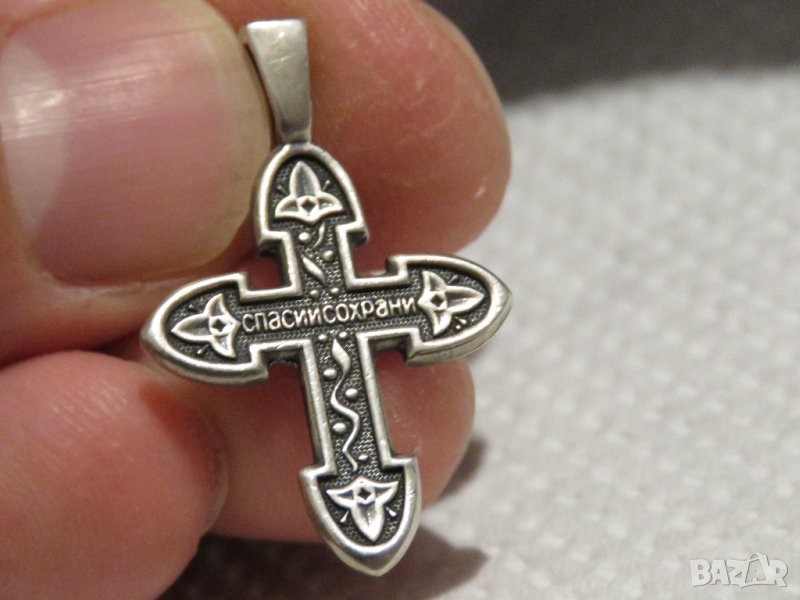 На гърба на кръста има надпис - Спаси и сохрани и има маркировка за сребро .