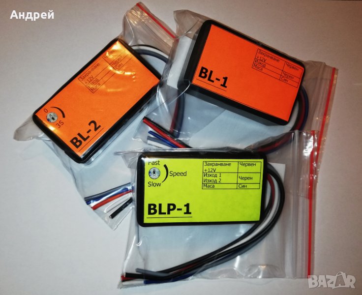Модул BLР1 - Модула е с два отделни канала като генерира серия от кратки премигвания последователно на всеки от изходите. Първоначално се генерират премигвания на изход 1 след което той се деактивира и се генерират премигвания на изход 2. Цикъла се повтаря. Ефекта наподобява на познатия ефект "Американска полиция". Има възможност за избор броя последователни премигвания от 3 до 6 в серия, както и плавно регулиране бързината /честотата/ на мигане. Натоварване на изходите 2х55W.