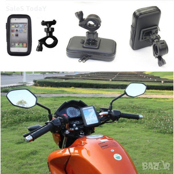 Поставката за телефон е подходяща за велосипеди, мотопеди, мотори, АТВ, скутери и др. Тънкият и лек калъф е водоустойчив и поддържа телефона Ви сух дори при силен дъжд. Здрава скоба за стабилно монтиране на кормилото с диаметър между 18 мм и 30 мм. Две части от подвижна пяна служат за поставяне на различни размери телефони. Специалното лицево фолио (тъчскрийн) позволява достъп до екрана ви, докато телефонът е в калъфа. Бърза и лесна инсталация без нужда от инструменти. Регулируемият държач ви позволява да въртите устройството си на 360° и под различни ъгли.Външни размери: 180х106х55мм.Вътрешни размери: 166х88х23мм. Телефона на снимките НЕ Е ВКЛЮЧЕН в цената !!! 44199 - 2486
