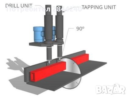 MЦ-350-90 Център за пробиване - нарязване на резба, особено пробиване на алуминиеви и леки профили, предназначена за нарязване на резба и рязане, масата на която са свързани профилите, извършва процеса на серво движени. Това е малка машина в производството за обработка на малки части от алуминиеви профили която извършва пробивни операции с регулиране на CNC отгоре след плъзгане и след това реже с трион, идващ отдолу.