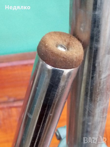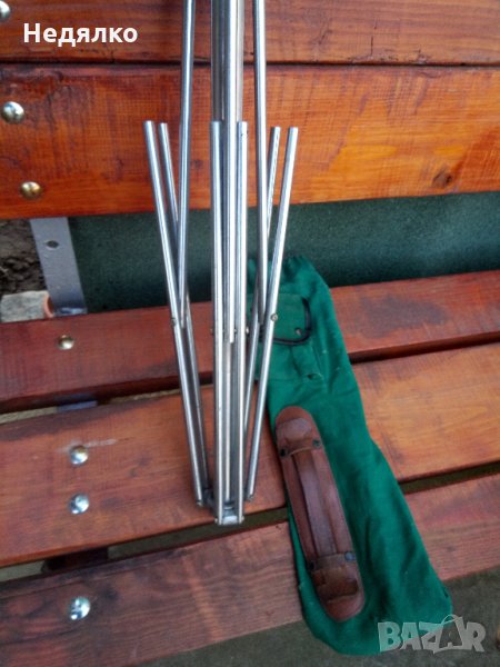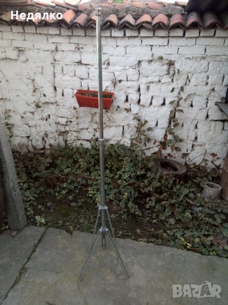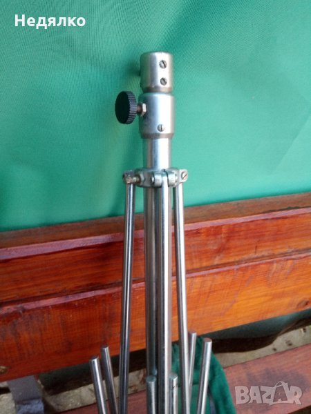 Автентична,старото супер качество,цялата е от неръждаема стомана,вечна на практика,само вътрешната тръба-удължител е от хромирана лека ръждаема стомана,с оригиналния си калъф,махимална височина разгъната около 160 см,сгъната-65см,вътрешна тръба- 64,5 см,диаметър-20 мм,трите лъча са с дължина 37 см,диаметър-10мм.Налични 2 броя, близнаци, цена за двете-250 лева.