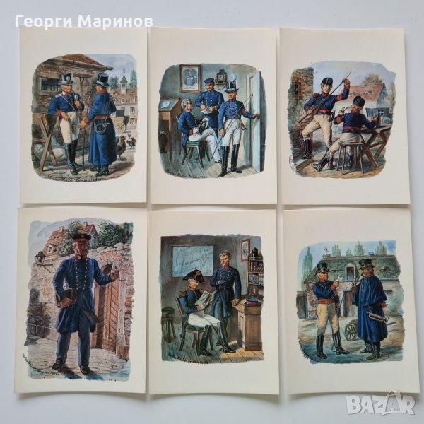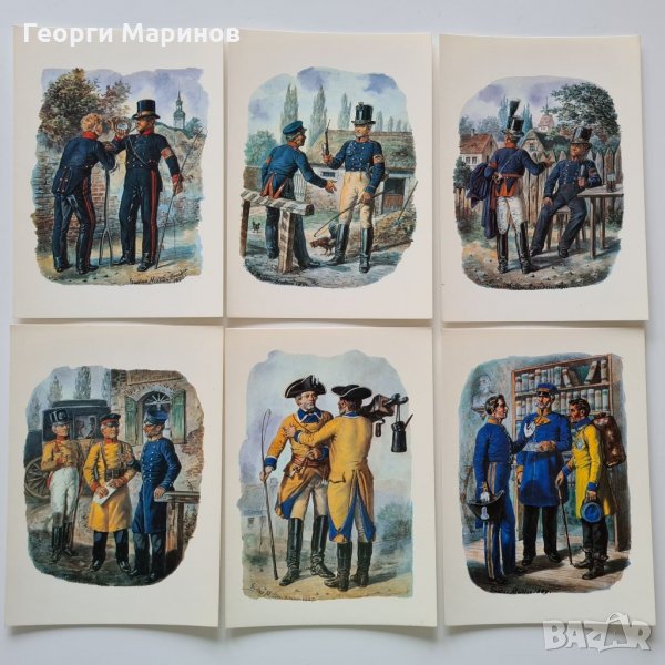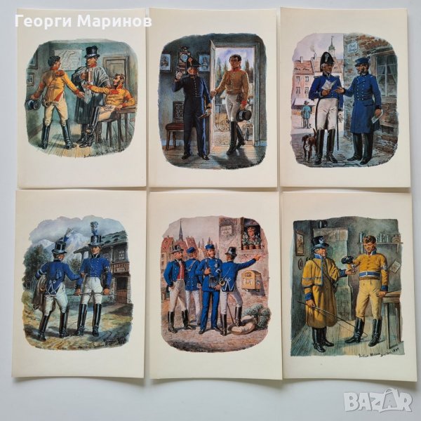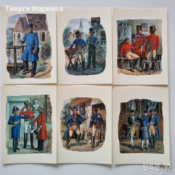 Картичките са в страхотно състояние, както си личи на снимките. Всичките картички са показани на снимките и може да ги разгледате. Мотивите са от картини (акварел) на Густав Мюлер от 1793 г. до 1891 г. Размерът на картичките е 10 cm x 15 cm. Обявената цена е за всички картички.