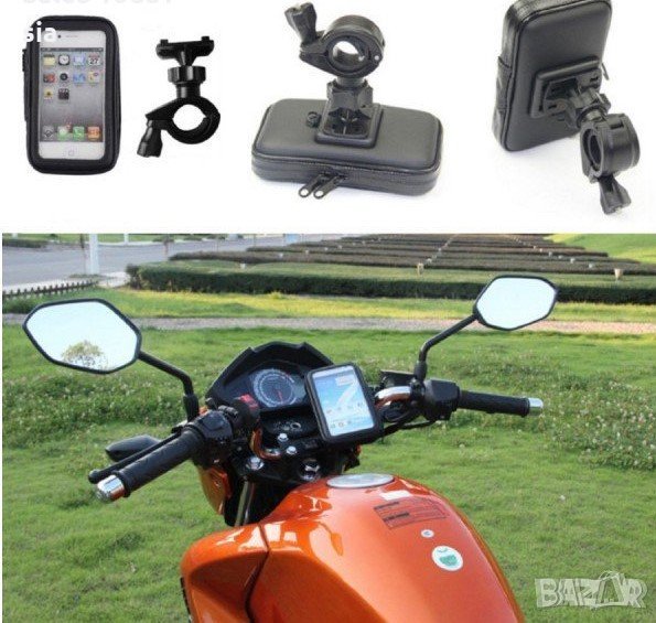 Поставката за телефон е подходяща за велосипеди, мотопеди, мотори, АТВ, скутери и др. Тънкият и лек калъф е водоустойчив и поддържа телефона Ви сух дори при силен дъжд. Здрава скоба за стабилно монтиране на кормилото с диаметър между 18 мм и 30 мм. Две части от подвижна пяна служат за поставяне на различни размери телефони. Специалното лицево фолио (тъчскрийн) позволява достъп до екрана ви, докато телефонът е в калъфа. Бърза и лесна инсталация без нужда от инструменти. Регулируемият държач ви позволява да въртите устройството си на 360° и под различни ъгли.