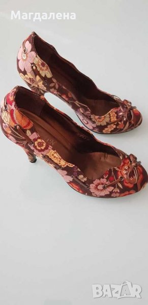 Дамски елегантни обувки,номер 37, от текстил на цветя, с височина на тока 8 см.Обувани са един, два пъти, като нови са.