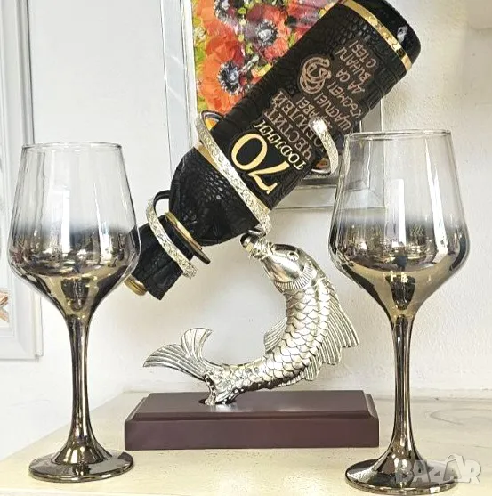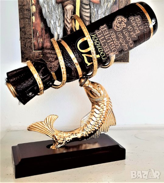 Оригинална поставка за бутилки - Сребърна или Златна риба с декорирана бутилка /пълна/ за всякакъв вид кръгла годишнина и юбилей - 40, 50, 60, 70, 75, 80 или 90 години.