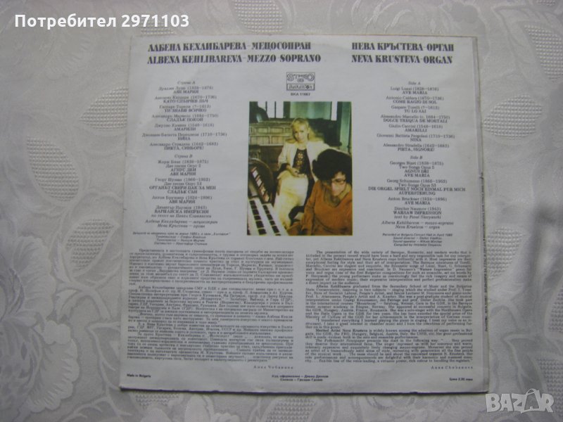 Грамофонна плоча - ВКА 11667 - Шедьоври за глас и орган. Албена Кехлибарева - мецосопран и Нева Кръстева - орган